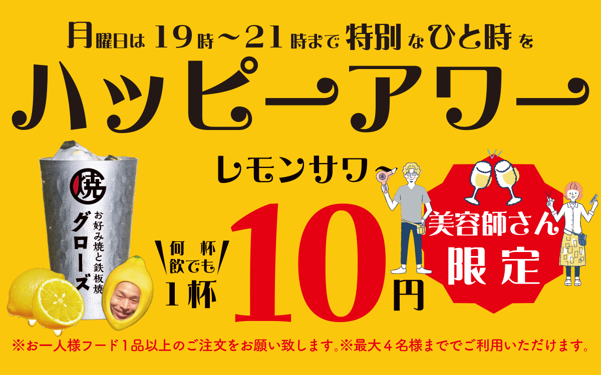 美容師さん限定で月曜日の19時から21時にハッピーアワーを開催いたします!